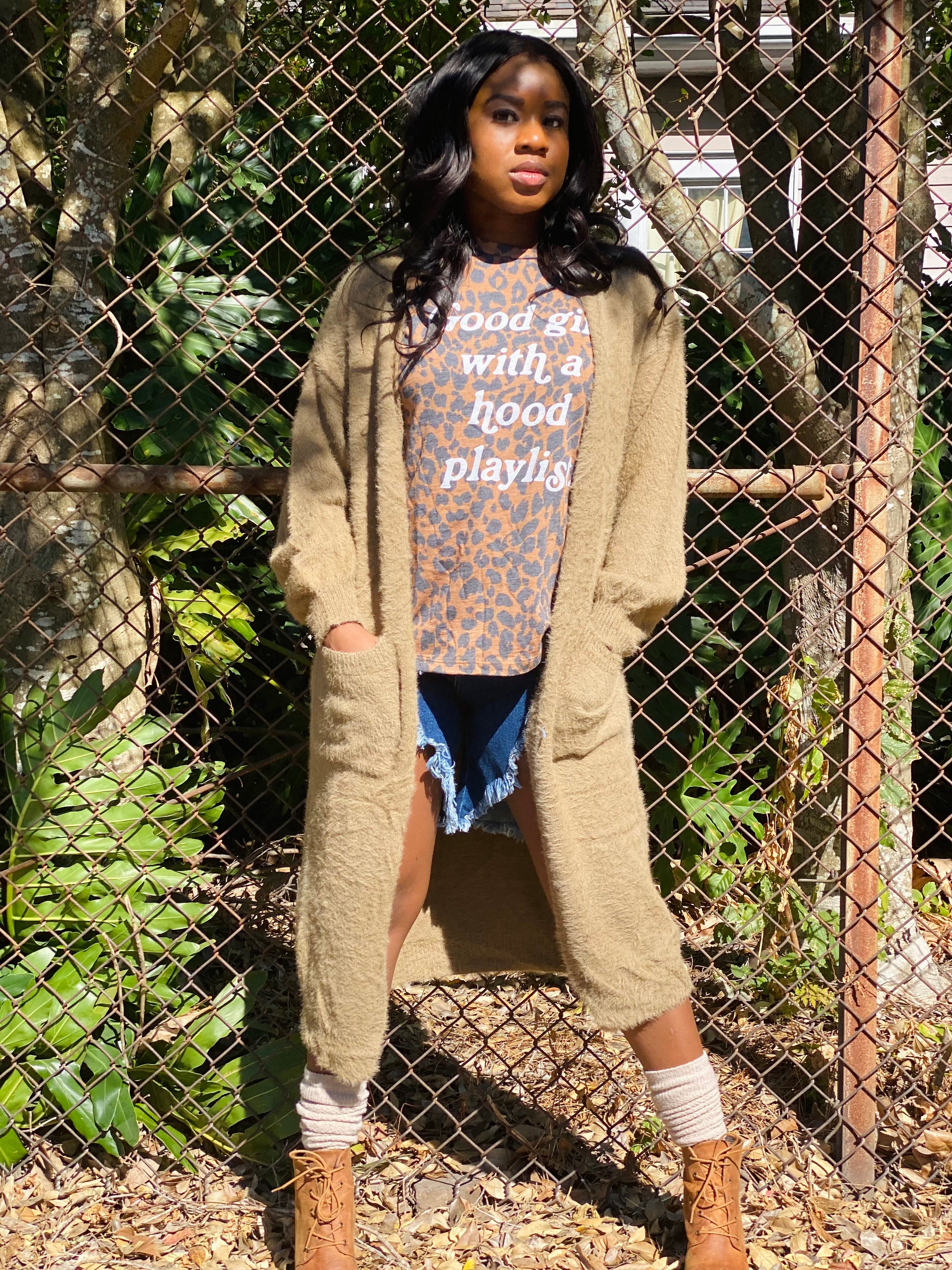 Take the chill off with the super cute cozy long sleeve duster cardigan sweater. This soft and slightly fuzzy cardigan sweater has long sleeves with drop shoulders and an open-front design that ends at a duster length. Two front patch pockets are perfect the perfect detail for this adorable sweater. Shop the tee and denim for the Luxe Look!